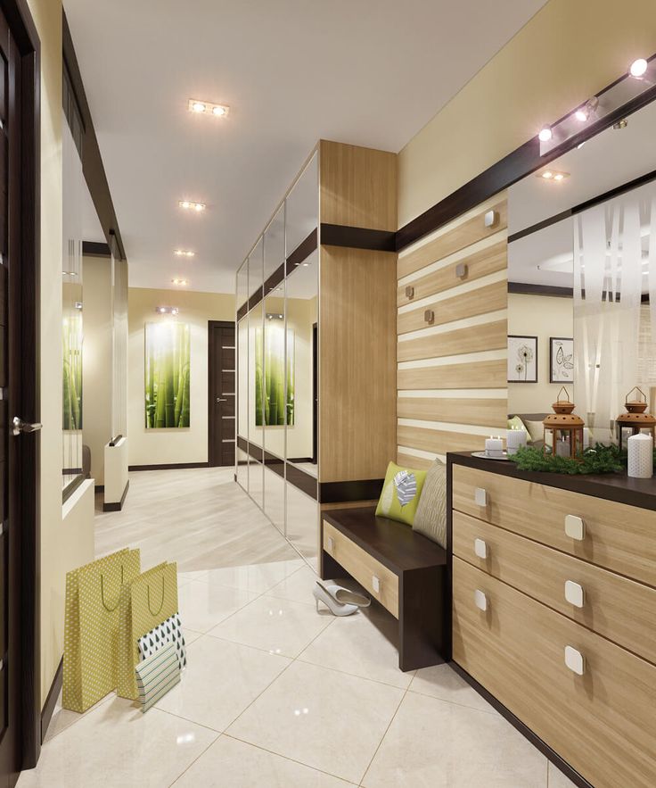 Обязательно наличие зеркала: этот атрибут желательно выбирать ростовым. О других особенностях дизайна прихожей в квартире расскажем ниже. Вы узнаете о современных цветовых решениях в интерьере, об актуальных стилях, какие материалы сегодня чаще используют на стены и пол.