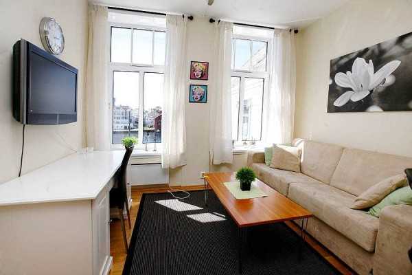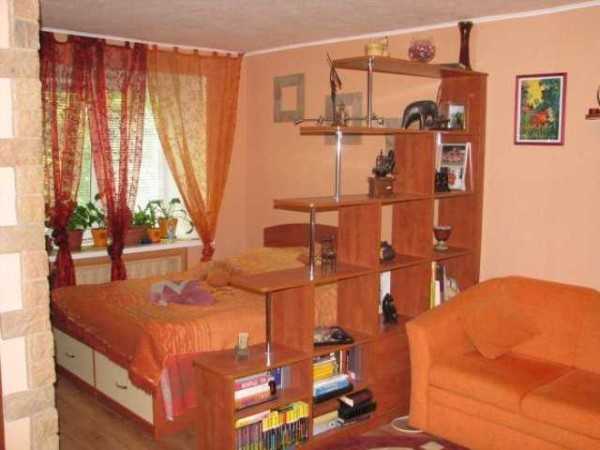 Такой вариант приемлем, если живет в квартире один человек. Если же людей двое — это уже не очень удобно: кто-то хочет спать, кому-то еще не спится. В таком случае стараются отгородить часть комнаты полупрозрачной перегородкой и за ней разместить кровать. Оставшуюся часть обставляют как мини-гостиную.