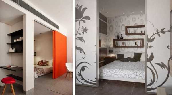 Они могут раздвигаться в разные стороны (фото справа) или складываться в одну из сторон. Если такую перегородку сделать зеркальной, она еще и расширит визуально пространство.