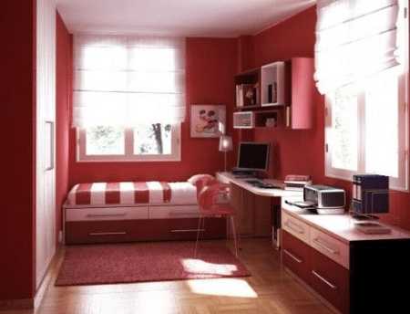 1. Дизайн спальни с рабочим местом в красных тонах.