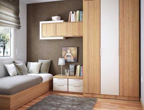 Еще идея обустройства маленькой спальни — изголовье кровати встроить в мебельную стенку. С точки зрения фен-шуй это неправильно, но с точки зрения рациональности — отличный вариант.