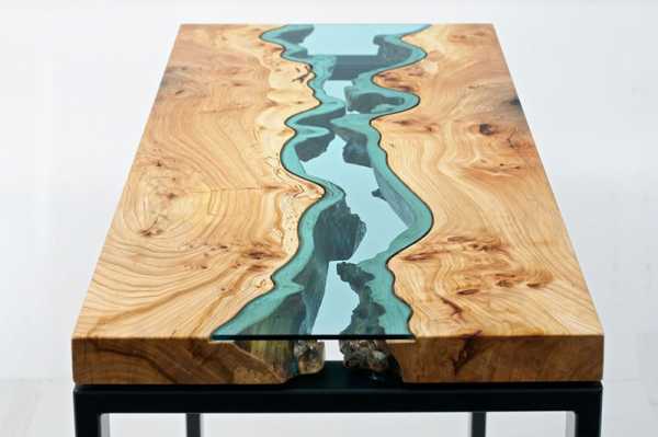 7. Стеклянный столик с натуральным деревом, выглядящий, как протекающая река.