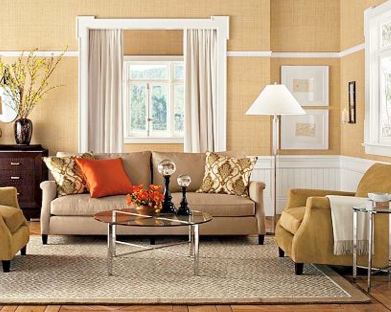 Для триадного цветового построения на хроматическом круге необходимо выбрать три равноудаленных цвета. Например, синий — зеленый — желтый, красный — оранжевый — желтый, синий — фиолетовый — красный. Как и в предыдущем случае, один цвет выбирается в качестве основного, остальные два лишь оттеняют его. Данный подход позволяет оживить интерьер гостиной яркими цветами, однако их контрастность будет меньше, чем при использовании комплиментарных цветов.