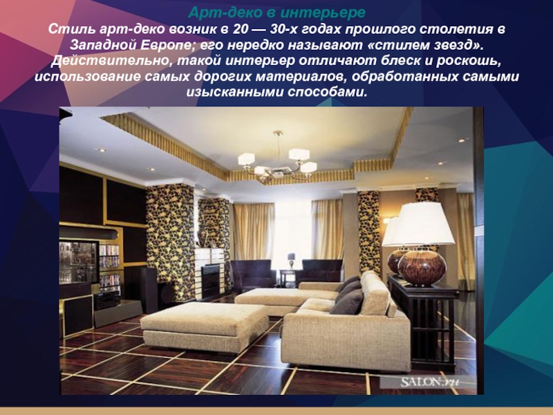 Если вас интересует, какие бывают стили интерьера, сочетающие в себе обилие абстрактных мотивов, выразительных цветов и сложных орнаментов, при этом остаются практичными, обратите свое внимание на ар-деко. Мебель такого стиля впервые в Париже была представлена в 1925 году на тематической выставке. Данное направление представляет собой интересное соединение модерна, этники и неоклассики.
