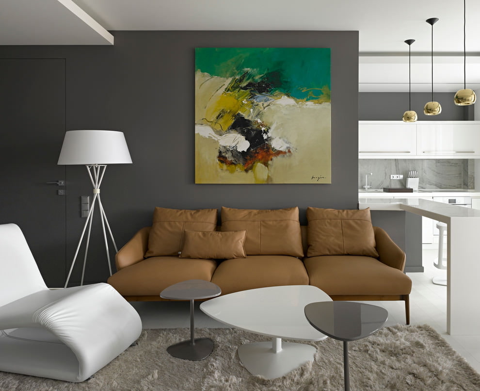 Оптимальный размер — от 30 см. - Сюжет изображения должен соответствовать стилю гостиной. В классических интерьерах хороши пейзажи и портреты, в то время как для современных стилей (хай-тек, лофт, модерн и пр.) лучше подойдут абстрактные изображения и индустриальные пейзажи.