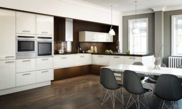 Кухонный гарнитур подбирайте с гладкими поверхностями фасадов. Столешницей имитированной под камень. В общем наличие чистых линий и углов приветствуется. Крупногабаритная плитка из керамогранита на полу будет гармонично сочетаться со стеклянным фартуком на стене. Добавьте подвесные светильники, чтобы улучшить освещение и добавить мерцания от отражающих поверхностей.
