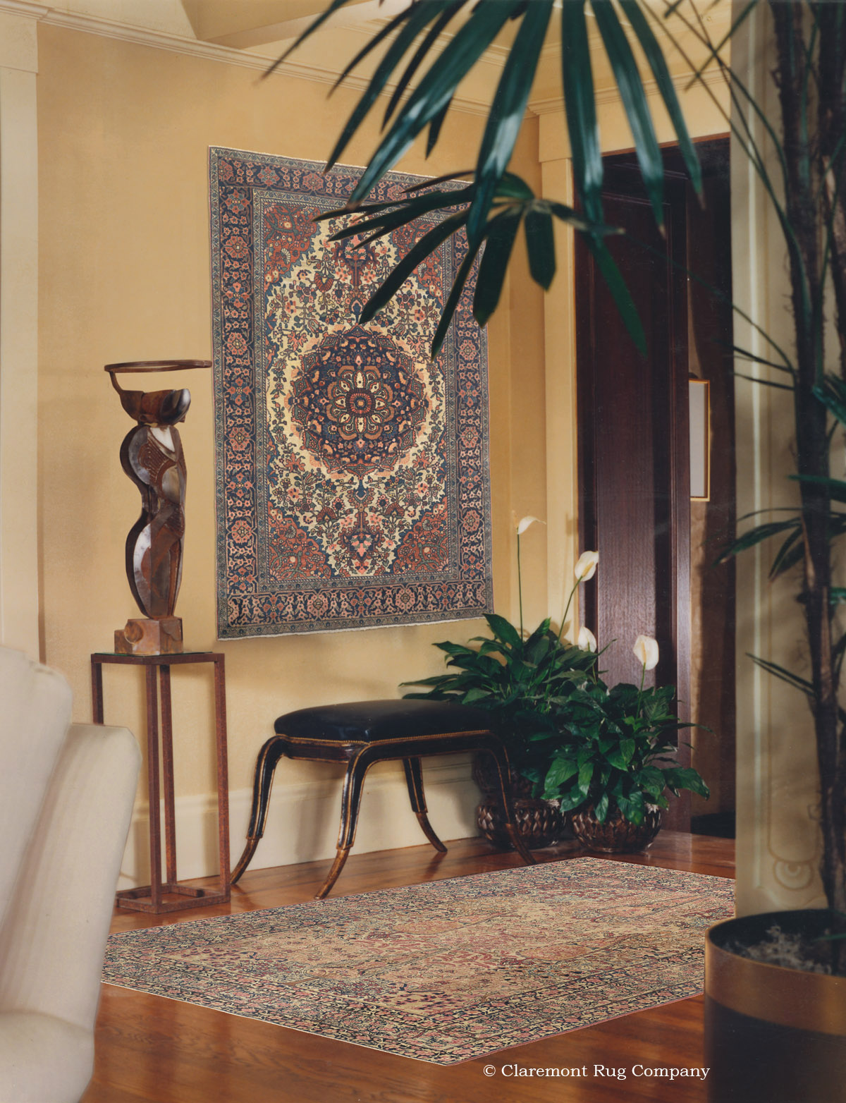 Выигрышным акцентом помещения могут стать покрытия, выполненные в различных стилях и техниках. Натуральный старинный шерстяной ковер, выполненный руками искусных мастериц, станет настоящим шедевром в обстановке комнаты. Такой жалко затаптывать ногами, ему действительно по чину занимать центральную стену богато обставленной комнаты.