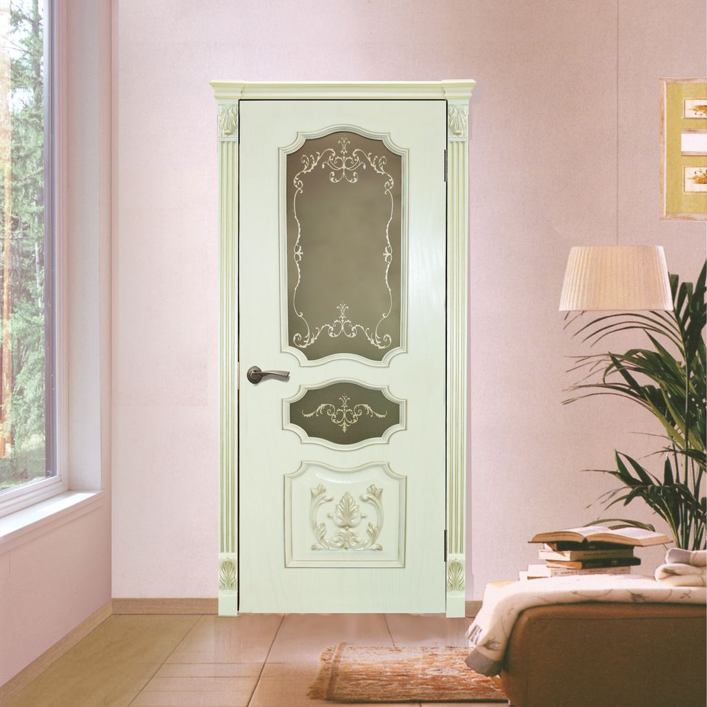 Такие двери выглядят стильно и оригинально. Стекло визуально увеличивает помещение, поэтому их часто используют для малогабаритных комнат. Существует широкое разнообразие дизайна стеклянных моделей. Это может быть матовое, тонированное, зеркальное, прозрачное или витражное стекло. Более того, стекло часто украшают пескоструйным рисунком. Стеклянные модели обладают следующими преимуществами: