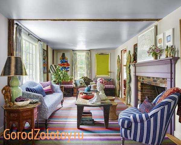 Текстиль способен творить чудеса, особенно, когда нужно сделать комнату более располагающей, нетривиальной. Используйте тонкие хлопковые или полушерстяные коврики небольших размеров, но обязательно с этническими мотивами в узоре (полосы, волны, нордические звезды, ромбы и элементы народных орнаментов сейчас особенно популярны). Подобную вещь легко вписать в современную обстановку