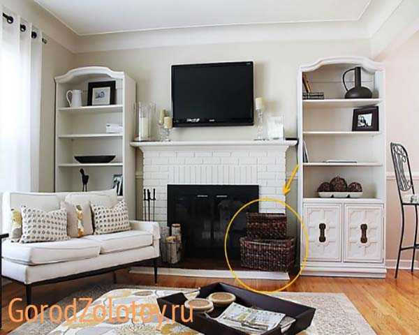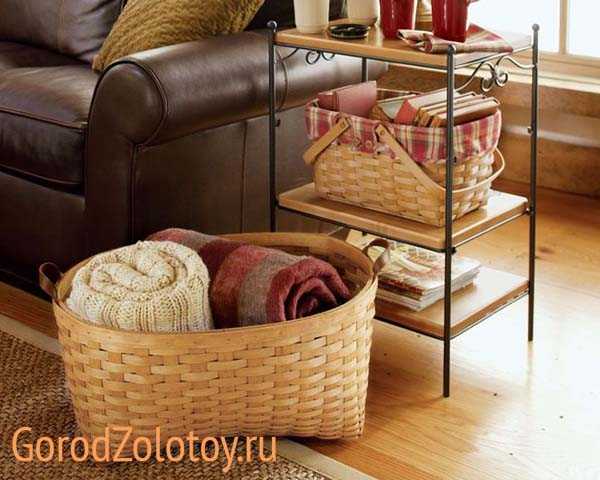 Хорошо, если «в поддержку» корзинам в интерьере большой комнаты есть другие плетеные предметы (вазы, кресло и т.д.).