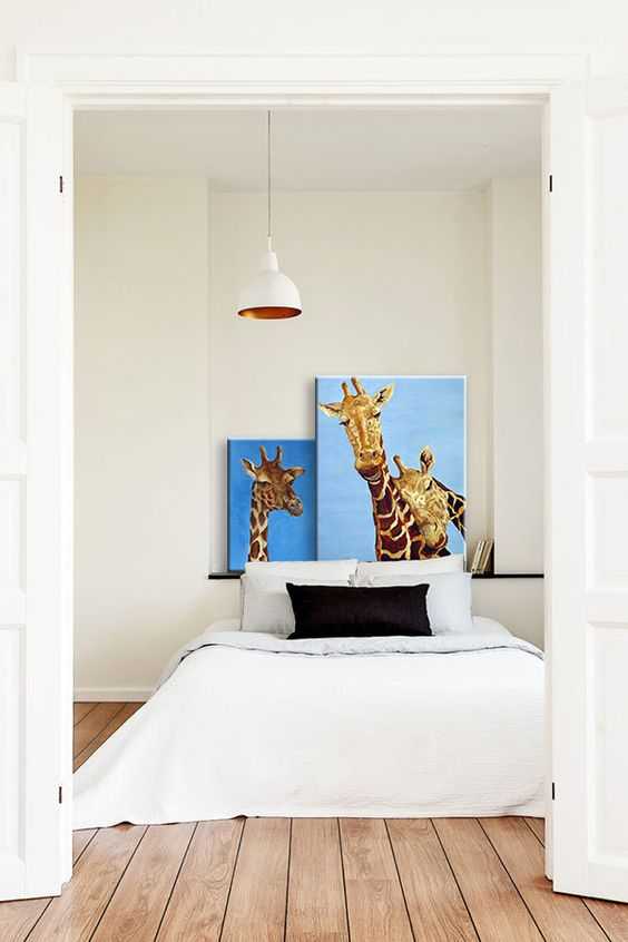 Проще говоря, не стесняйтесь использовать в оформлении вещи, которые нравятся именно вам. Так, современная, слегка наивная живопись, как на фото ниже, делает аскетичную спальню уютной именно благодаря ироничному, неожиданному в подобной комнате, изображению влюбленной пары жирафов