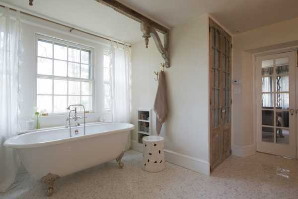Взгляните на фото, представленное ниже, оно передает интерьер ванной комнаты, в котором установлены старые деревянные двери и декоративная балка. При этом, очевидно, что помещение было отремонтировано совсем недавно, ведь облицовка поверхностей, сантехника и аксессуары буквально «дышат» новизной.