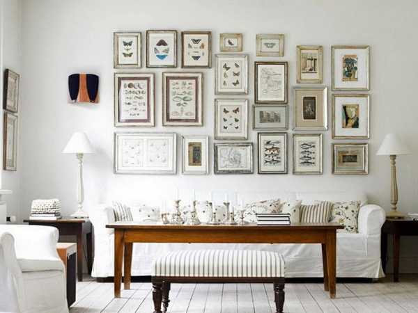 Чинно развешенные в ряд картины и фотографии – это скучно. Можно сделать часы из фотоснимков, отделать рамками пустующий угол или собрать разноформатные картинки в оригинальное панно-мозаику.