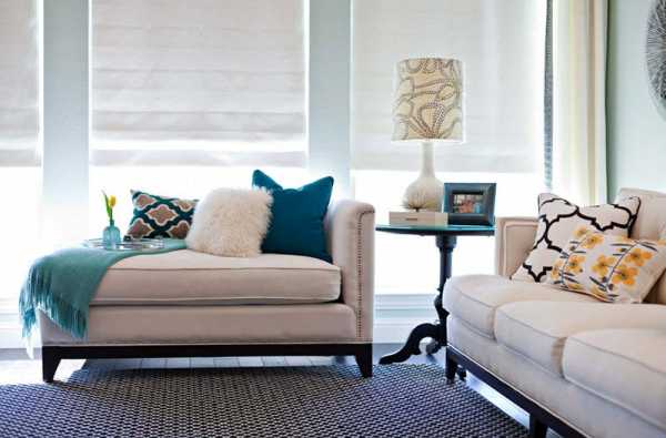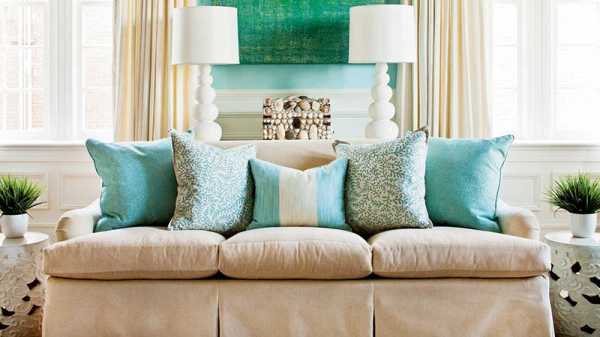 - Цвет подушек должен повторяться в других вещах, которые есть в комнате (занавесках, ковре, обоях, светильниках, цветочных горшках и т.д.).