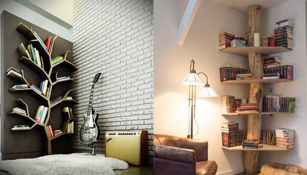 Книжные шкафы отходят в прошлое, а стандартные прямоугольные полки делают комнату похожей на библиотеку. Стеллажи неправильной формы, угловые, в виде дерева или замысловатой фигуры преобразят помещение. Пару книг можно небрежно оставить на столике или прикроватной тумбочке – это смотрится очень мило.