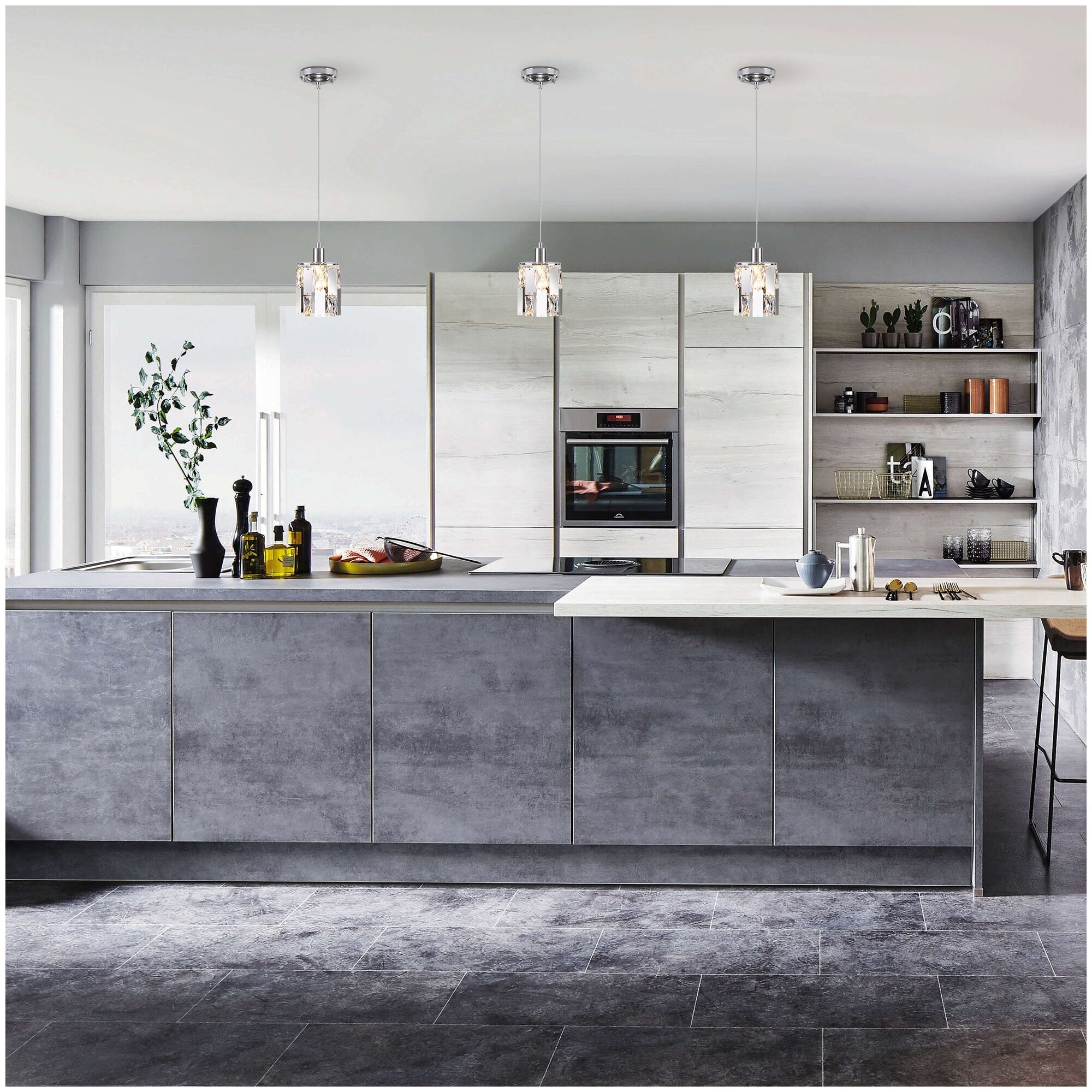 Кухня со столешницей и островом из вощеного бетона в сочетании с металлическими светильниками