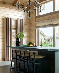 Конструкция-остров для интерьера кухни в деревянном доме подойдет как нельзя лучше. Она может стать одновременно обеденным столом, рабочей столешницей, системой хранения. Если места мало — разграничьте его угловой стойкой из древесины или МДФ. Для этих же целей подойдет другая мебель: диван, шкаф.