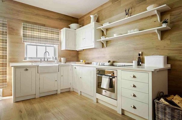 Горизонтальная укладка досок расширит помещение, вертикальная — вытянет вверх. Можно сочетать их друг с другом. Фартук покрывают керамической плиткой, мозаикой или водоустойчивыми панелями с подходящей расцветкой и рисунком.