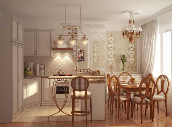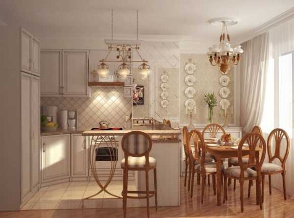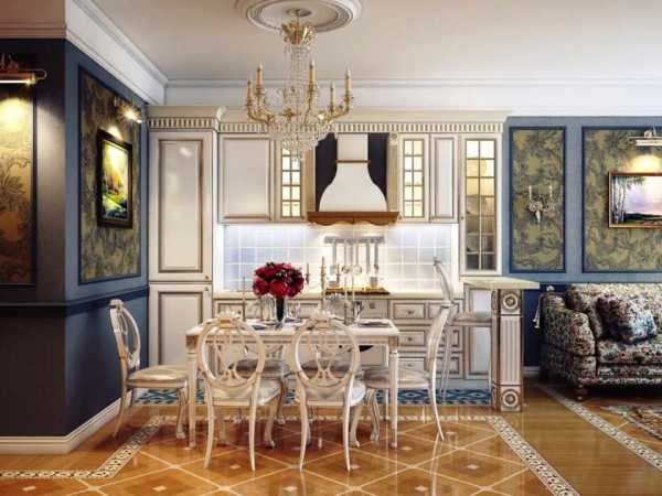 В небольших городских квартирах, а не загородных домах чистый прованс встречается редко. Зато он прекрасно сочетается с легкой современной классикой. Светлый интерьер в классическом стиле с элементами прованса очень хорош для оформления кухни-гостиной в небольшой студии или типовой малогабаритной квартире.
