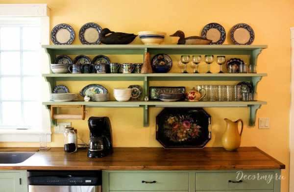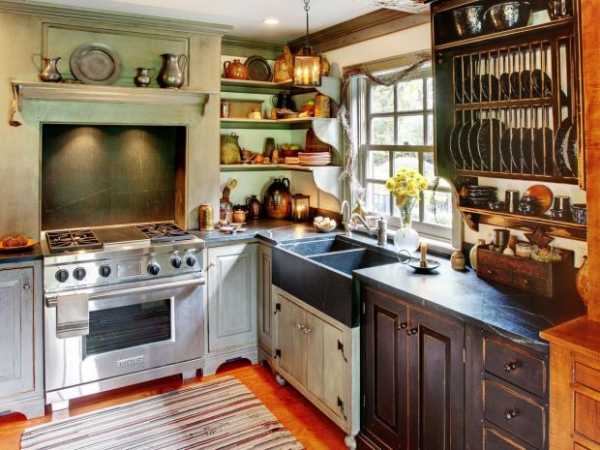 Любые находки на чердаках вашей бабушки подойдут вам на кухню. Это могут быть разные плетеные корзины, кувшины с треснувшими краями, бутылки для жидкостей и настоек, разного рода миски и посуда. Все это можно использовать как по назначению, так и лишь для декора вашей кухни. Они совсем не обязаны быть из одной цветовой гаммы или стилистики, чем разнее будут их формы и цвета, тем лучше. Здесь-то вам и пригодятся открытые полки.