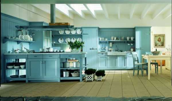 Очень часто на кухнях используют матовый голубой цвет. Он передает чистоту неба и лазурность Франции. С ним отлично сочетается светлое и темное дерево, медная фурнитура и все оттенки, которые присущи этому стилю. Но если в ваши окна редко заглядывают лучи солнца, то есть опасение создать холодный интерьер.