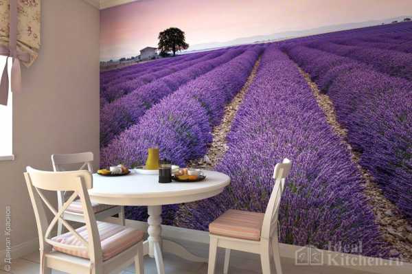 Зрительно расширить маленькую кухню и добавить в интерьер ярких красок помогут фотообои с убегающими вдаль лавандовыми полями, цветущими лугами, старинной улочкой или морскими далями.