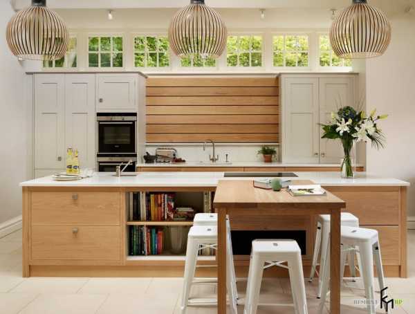 - мебель из светлого дерева с фасадами простых форм, много открытых полок, где хранятся баночки со специями, кофе, емкости с крупами, сухофруктами, плетеные корзиночки с фруктами;