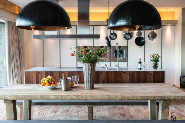 Оформление освещения зависит от стиля интерьера кухни. Но в любом случае, если потолки с балками, то стоит подумать о точечных светильниках или мини-прожекторах, установленных на них.
