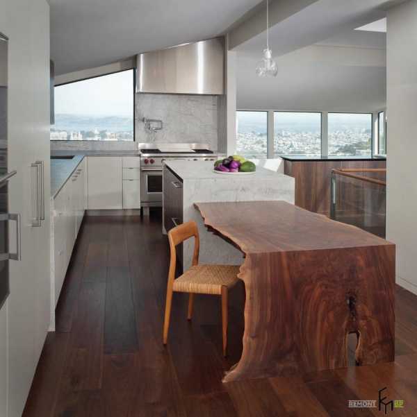 Большая кухня в деревянном домеДеревянные дома имеют главную особенность, которая во многом и определяет их внутренний дизайн – со временем они дают сильную усадку. Это процесс может длиться не один год. Поэтому дома из бруса или бревна редко штукатурят, не обшивают гипсокартоном, листами фанеры, другими панелями. Но это совершенно не мешает обыграть «голые» деревянные стены даже на кухне в современном стиле.