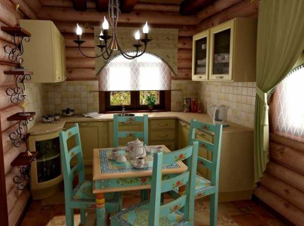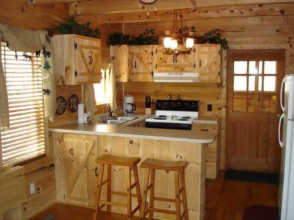 Маленькой кухне в деревянном доме с отделкой из натурального материала всегда будет не доставать света, из-за чего она будет казаться еще меньше. Компенсировать данный недостаток можно с помощью светлых цветов в интерьере (светлая мебель, фартук и т.д.) и большим количеством осветительных приборов.