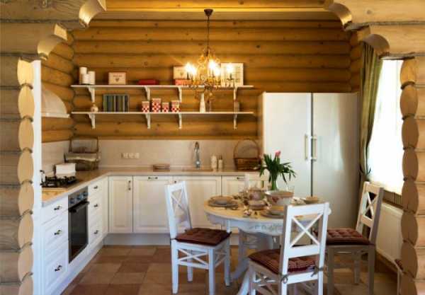 - стены кухни остаются бревенчатыми, их только немного «облагораживают», зачищая и покрывая специальным лаком, который подчеркнет фактуру дерева;