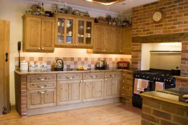 Здесь будет уместен гарнитур с филенчатыми фасадами или гладкими под дерево, с элементами потертости, состаренности.
