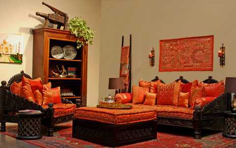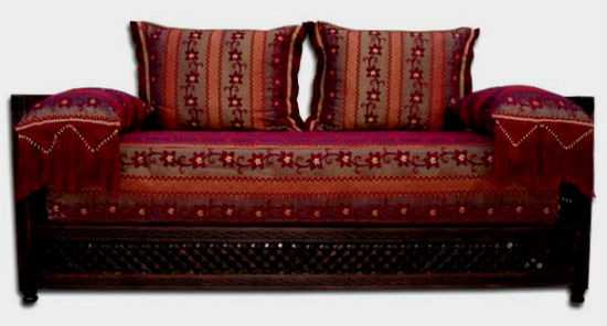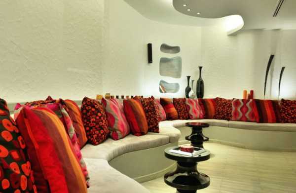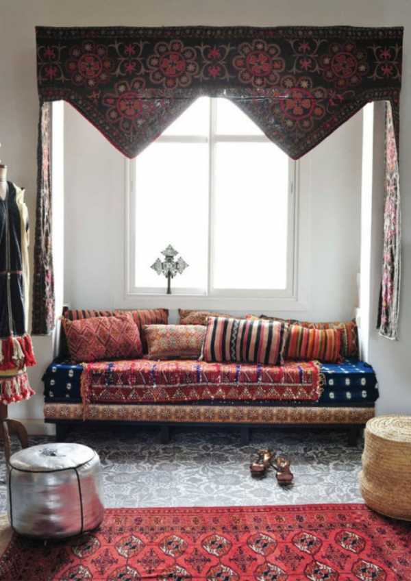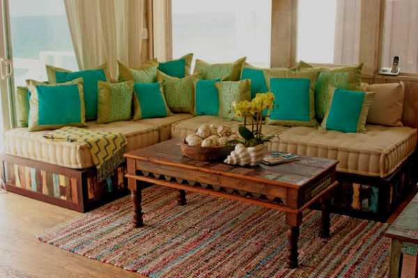 Кроме того, она может быть резной, инкрустированной мозаикой, украшенной разнообразными узорами. Среди видов мебели преобладают диваны, тумбы, скамейки, кушетки, пуфики и низкие столики. На диванах должно быть множество подушек различных форм, размеров и расцветок. Самые распространенные материалы – органза, бархат, шелк.