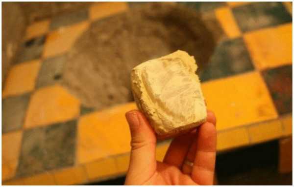 Таделакт прекрасно ложится на глиняные, известковые, цементные, гипсовые поверхности и при этом имеет отличные водоотталкивающие качества. Это водонепроницаемая натуральная штукатурка, которая наносится с помощью шпателя, а затем сжимается до плотной гладкой поверхности с помощью камня и таделакт мыла. Мыло проникает в таделакт и создаёт водостойкую поверхность.