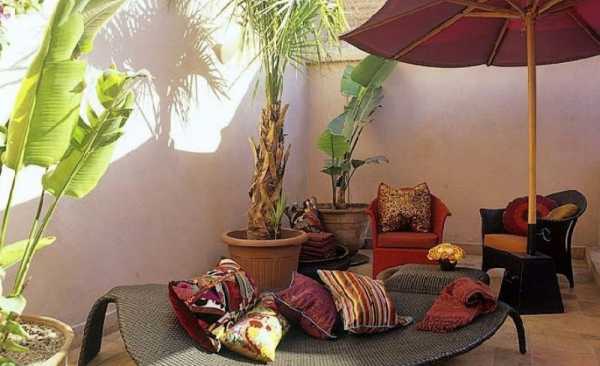 Важно! Прекрасный вариант, если гостиная в марокканском стиле будет совмещена с зеленым садиком или лоджией с комнатными растениями и цветами.
