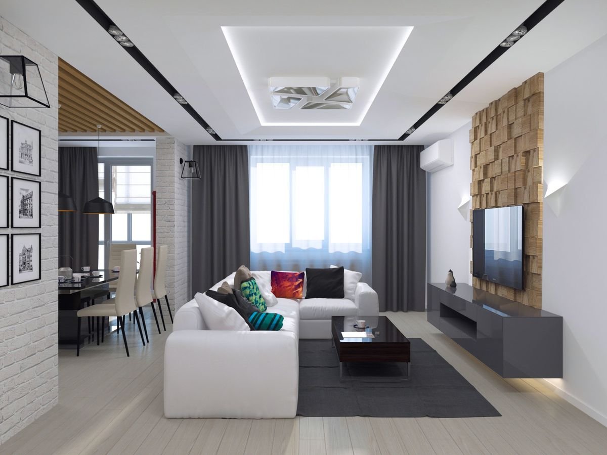Ремонт гостиной в стиле минимализм – отличная возможность установить натяжной потолок, предпочтительно, глянцевый. Многоуровневые потолочные конструкции используется как один из приемов зонирования пространства.