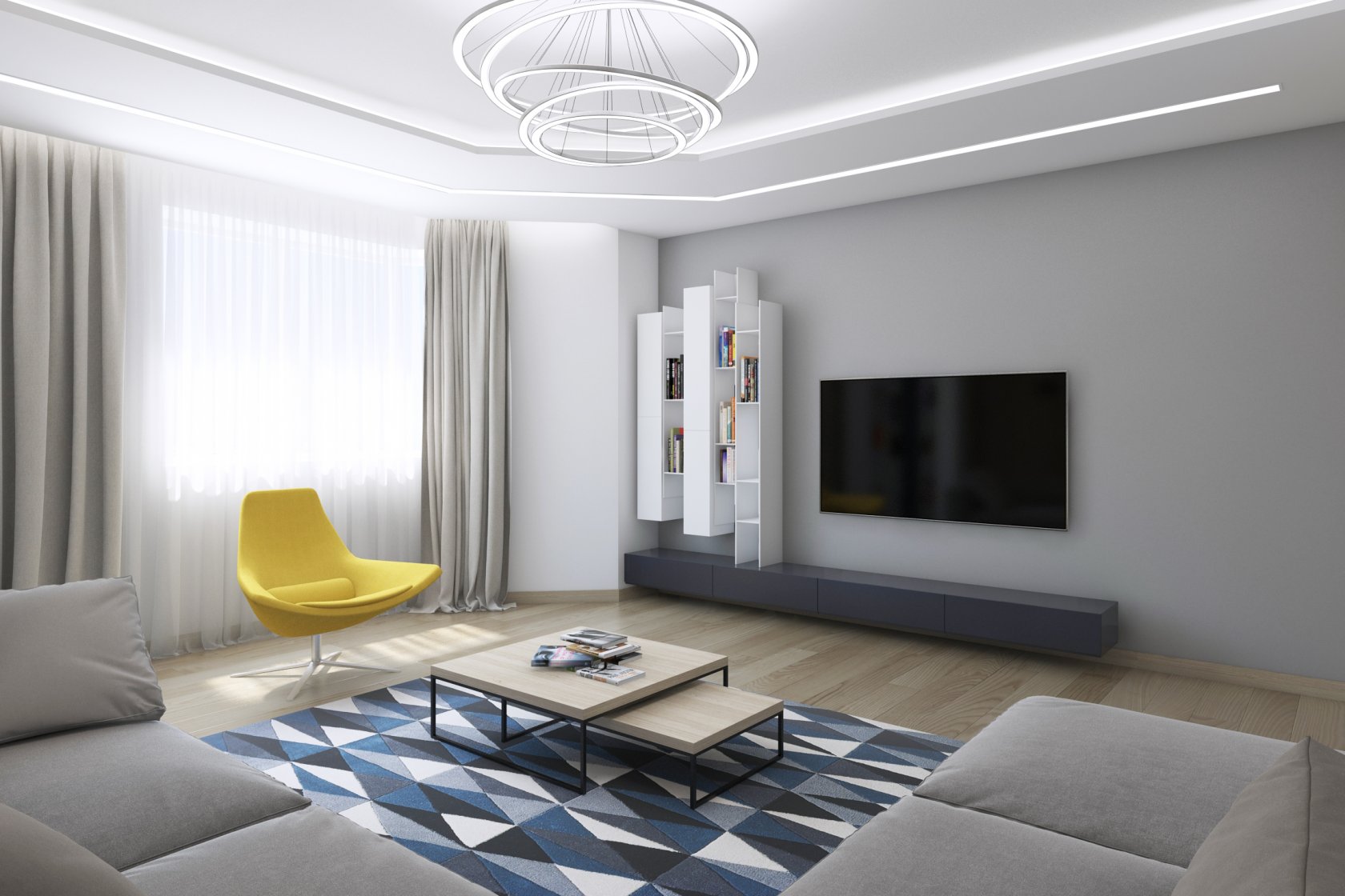 Интерьер гостиной в стиле минимализм любит простые формы и геометрические линии. Освещение в такой комнате всегда приглушенное, чаще используются LED-лампы, которые располагаются по периметру и прячутся за гипсокартон. Хорошо смотрится многоуровневое освещение: плафоны круглой или кубовидной формы, точечные светильники. При выборе обоев остановиться следует на однотонных вариантах, орнаменты и разнообразные рисунки не подойдут. Хорошим дополнением в гостиной будут большие окна, с прозрачными шторами, которые добавят естественного света и увеличат пространство. Двери можно заменить арками. Плинтуса в данной стилистике не применяют, так комната становиться выше и создается ощущение невесомости.