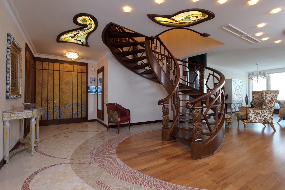 В отличие от стен, выполняющих функцию фона, в отделке потолка можно не скупиться и проявить фантазию. Привлекайте внимание к потолку витражами, балками или лепниной. Интересным решением станет окрашивание стен и потолка в один светлый цвет, чтобы сгладить переход.
