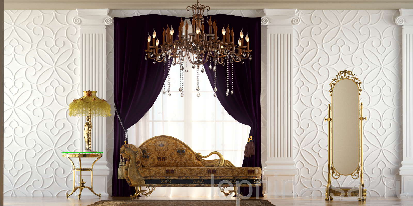 Гладкие и рельефные багеты различной толщины располагают вокруг фресок, гобеленов, картин зеркал. Из радиальных элементов выкладывают медальоны с декоративными вставками.