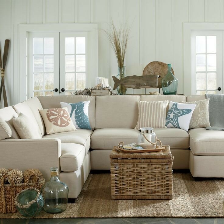 Морской стиль не может быть представлен без нескольких украшений или текстиля в данной тематике, которые помогают придать дому желаемое расслабляющее настроение. Белые, кремовые или серые стены упростят комнату, идеально соответствуя стилю. Расширьте диапазон цветов несколькими выцветшими оттенками синего и серого, сопоставляя с белым. Иногда, при необходимости, следует добавить немного граната или красного. Также будут работать оттенки бирюзы, относящиеся к цвету южных морей. Украсьте комнату коралловыми аксессуарами.