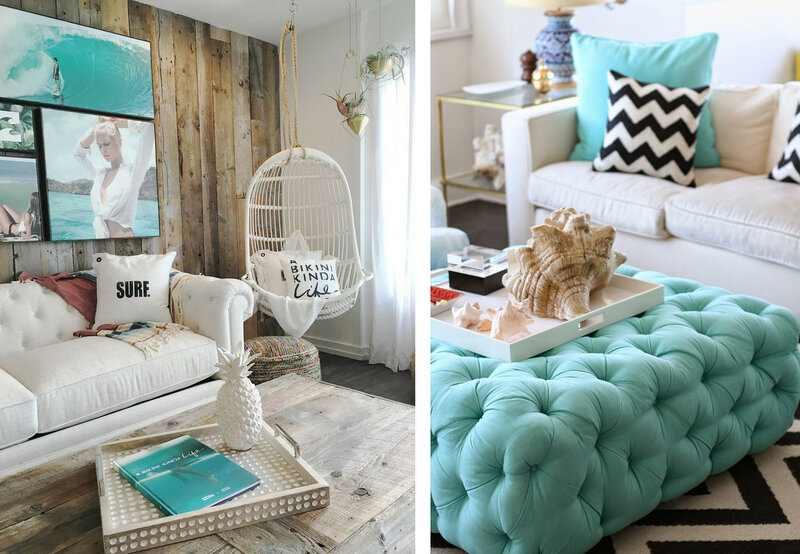Современная гостиная с аксессуарами цвета морской пены и пляжными сувенирами