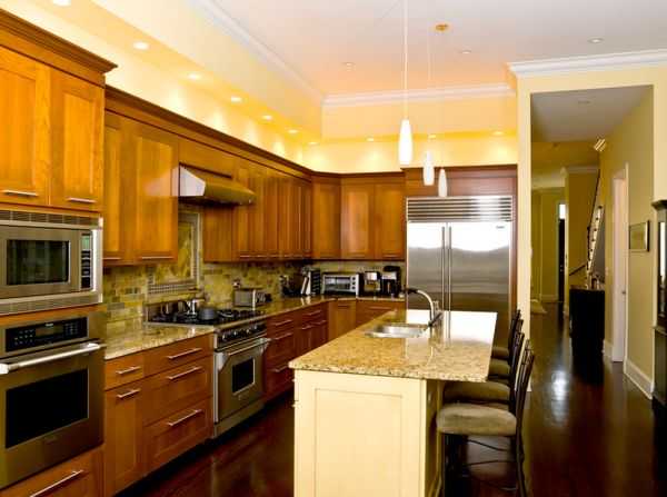 - Если вам нужно получить дизайн с подсветкой рабочей зоны (например, на кухне над рабочей столешницей), лучше использовать точечные светильники с прозрачным или зеркальным стеклом.