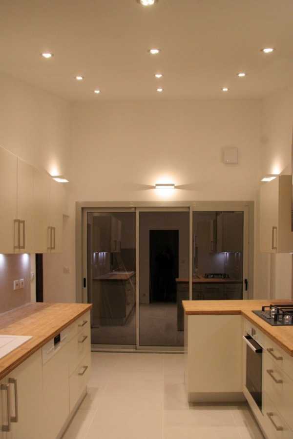 Если на кухне освещение имеет огромное значение, то в коридоре на нём не ставится акцент. Поэтому в кухне обустраивают модульного типа светильники, а в прихожей можно обойтись приглушённым светом.