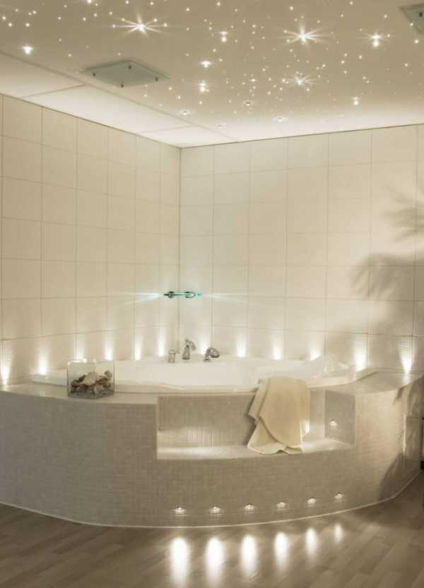 Осветительные устройства в ванной устанавливают согласно размерам комнаты. Для малогабаритного помещения подойдёт локальный свет, а большую площадь желательно зонировать, используя разного типа освещение.