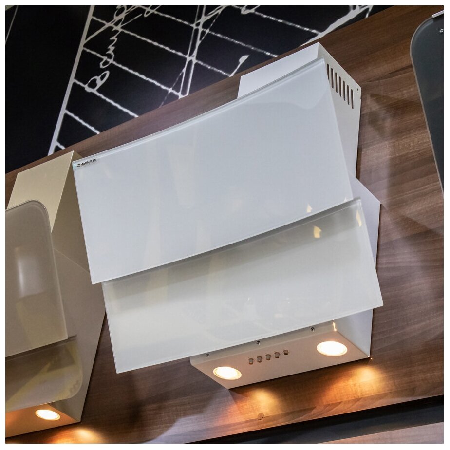 Прекрасным решением станут и стеклянные устройства объемных размеров. Их глянцевая черная или белая поверхность легко комбинируется с яркими матовыми цветами. Чтобы наполнить помещение домашним теплом и уютом, хорошо подойдет бежевая вытяжка, ее панели не будут выглядеть броско, и красиво подчеркнут оттенки мебели.