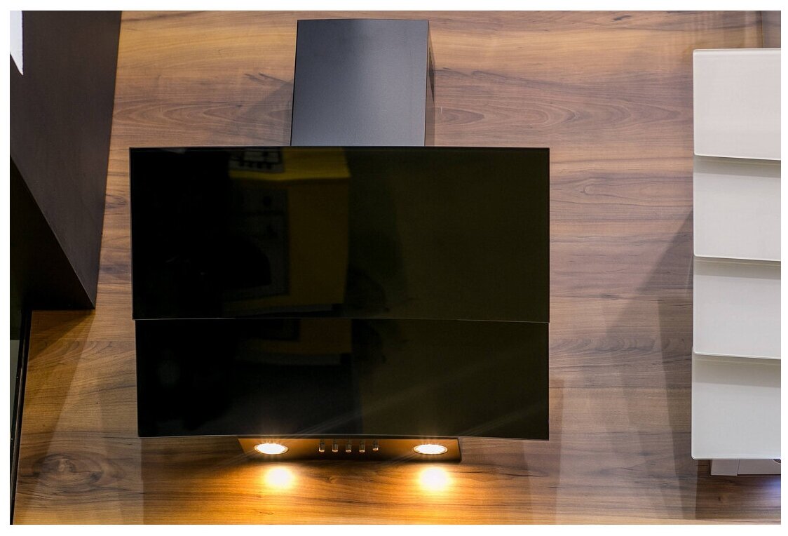 Что же касается черных наклонных вытяжек, то они легко подойдут под любой стиль. Они необычно смотрятся в помещениях, где в отделке присутствуют элементы с черными вставками.