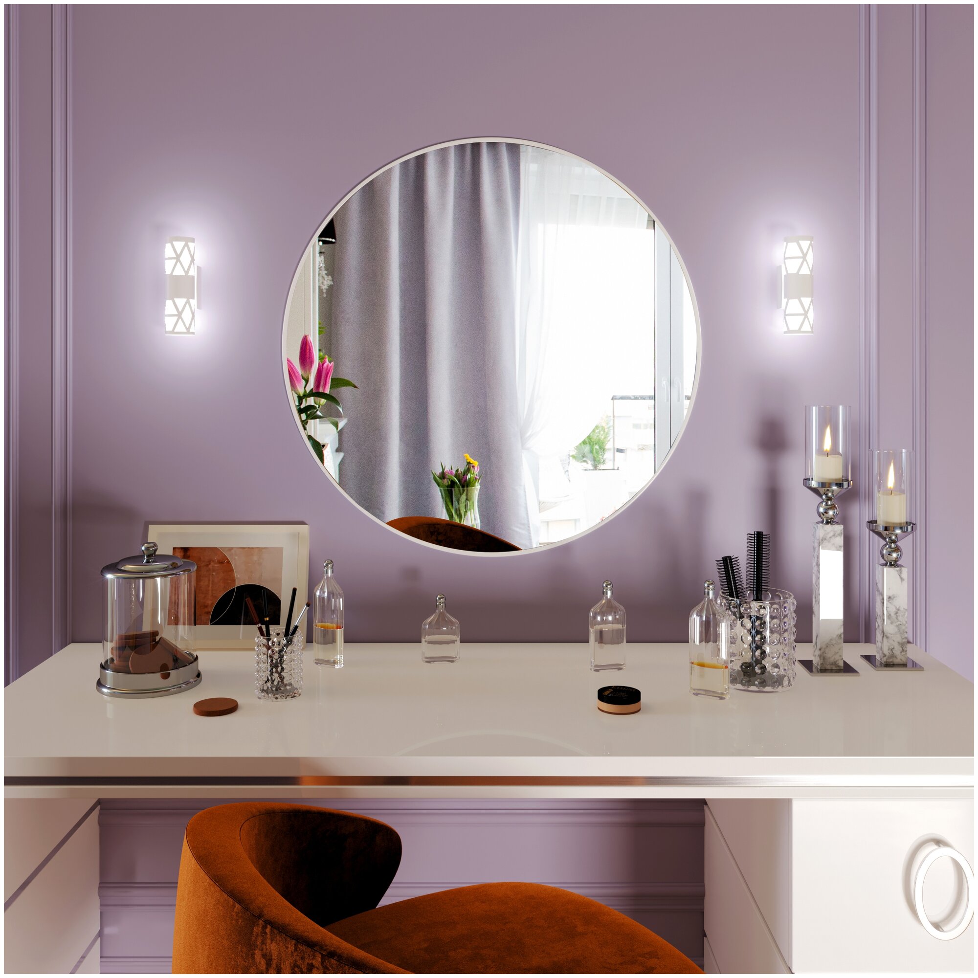 Эффект зазеркалья, пронизанного лучами искусственного солнца, позволит расширить тесные границы комнаты. При недостатке места в доме для организации будуара или размещения туалетного столика следует использовать этот предмет интерьера, оснащенный ярко-светящими галогенными лампами.