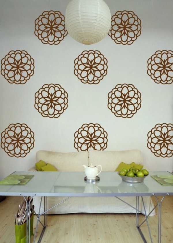 При помощи трафарета можно создавать рельефные рисунки на стенах, при этом особенно оригинально будут выглядеть как изящные классические узоры в ретро стиле, так и абстракция в стиле модерн.