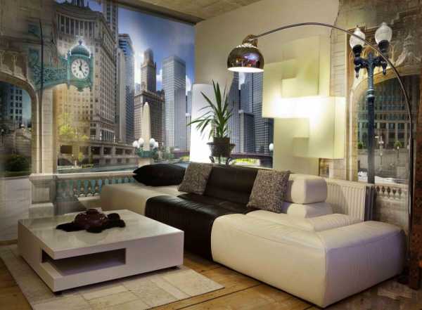 Небольшие рисунки с эффектом прорыва пространства стали излюбленным декором в стиле модерн. В просторных помещениях используются более масштабные природные или городские пейзажи.