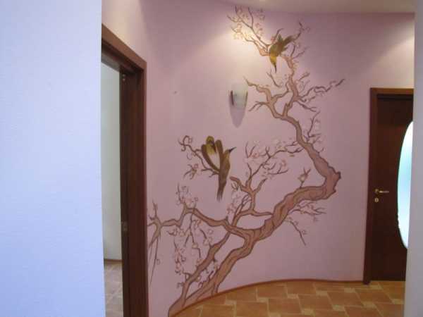 Другой способ – нарисовать в прихожей дерево, можно достаточно условно. Из раствора гипса или густой штукатурки вылепить объемные ветки, ствол, листья, плоды или даже библейских персонажей – Змея-искусителя, силуэты Адама и Евы вдали. Когда объемный декор высохнет, всю стену окрашивают в общий цвет мягким валиком.
